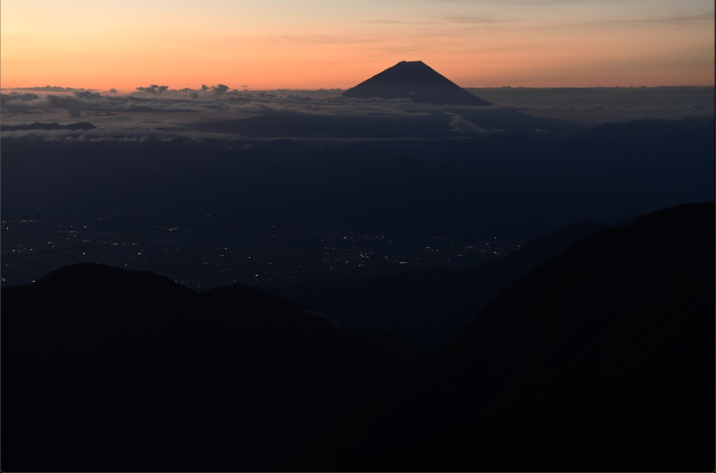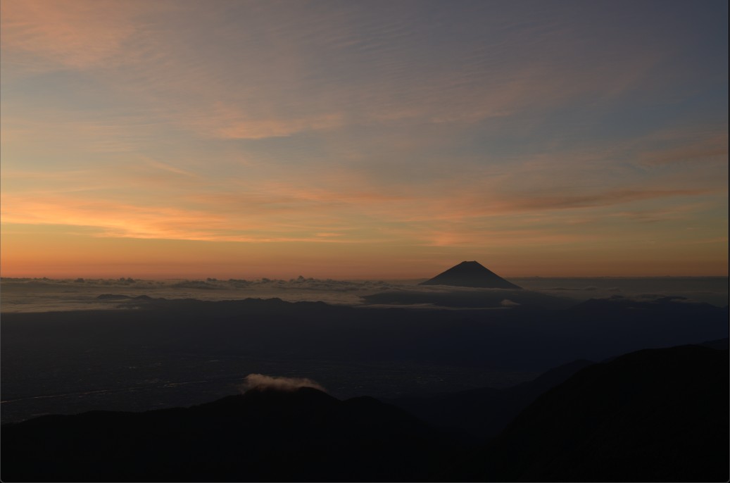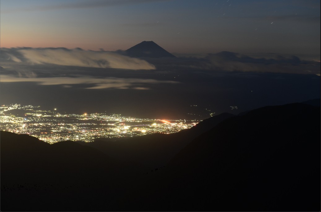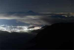 今度は阿弥陀岳からの富士山を見ようと、船山十字路の駐車場に車をとめ、18:30から歩き始めた。順調に進み、御小屋山まではほぼコースタイム通りに進んだ。その後、不動清水で水を補給し、登り始めたのだが、ここからが、大変だった。傾斜がきつくなり、さらにロープが出てきてそれにたよりながら、休み休み登った。はしごを登り、岩を登り、暫く進むと山頂に着いた。23:30頃だった。